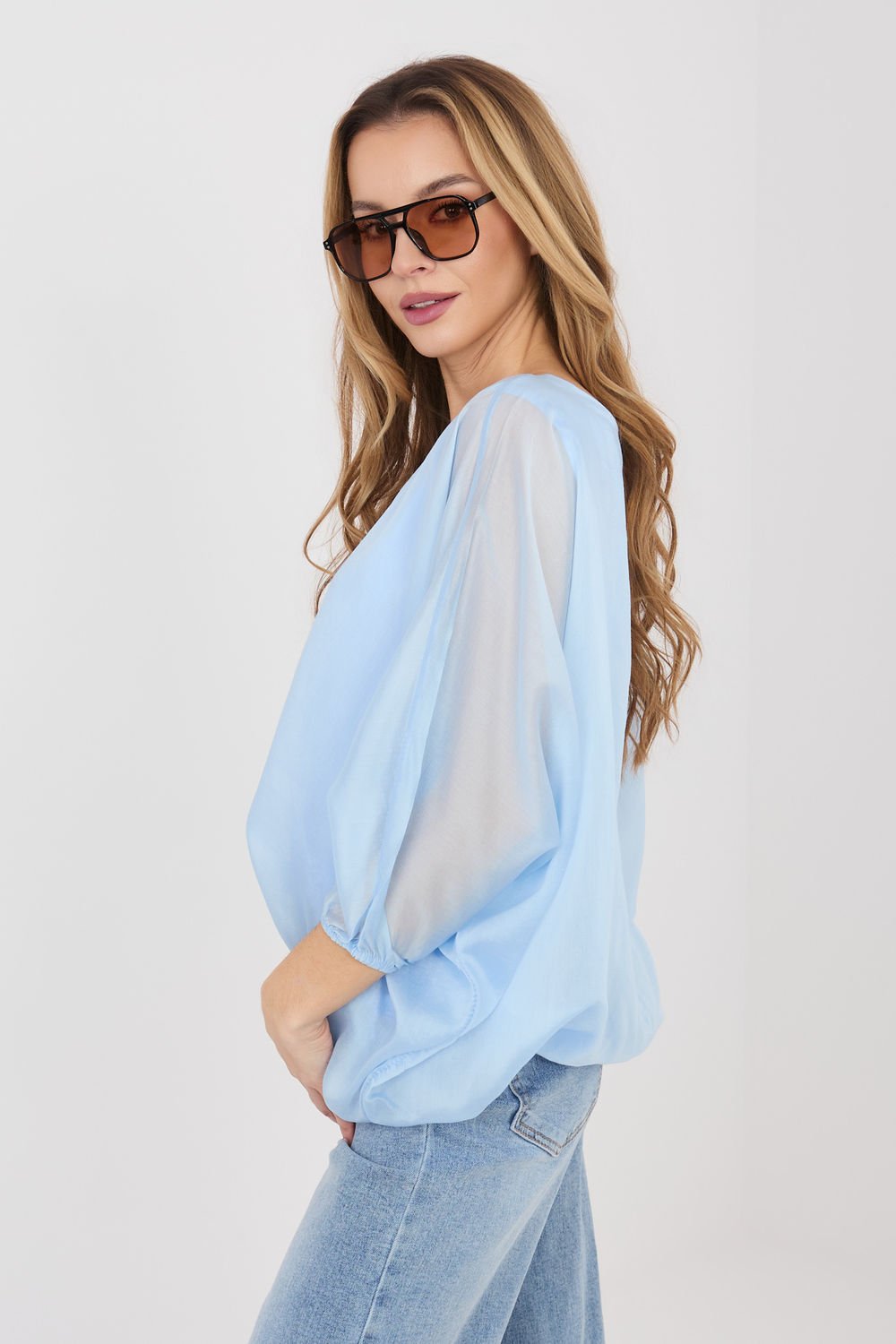 Elegant blouse of standard length, perfect for work and formal occasions, combining stylish look with comfort of wearing. The model made of a blend of tencel and polyester provides a pleasant softness and durability of the material. The blouse has a classic, round neckline and 3/4 sleeves, and a smooth pattern gives it a universal character. An additional advantage is the lining in the central part, which subtly shapes the silhouette and ensures an elegant fit under clothing. Ideal for both office outfits and more formal outings.