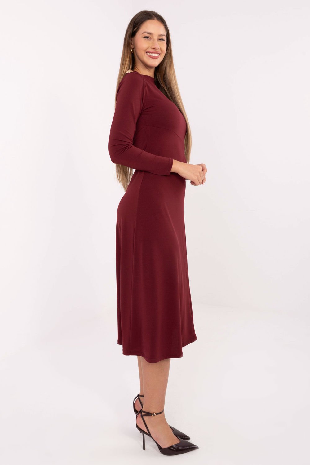 Elegant midi dress, perfect for various occasions from everyday outings, through work stylizations, to formal meetings. Made of a dominant blend of polyester and viscose, it ensures comfort, breathability, and delicate fit to the silhouette. The model stands out with a smooth, classic pattern that emphasizes the timeless character of the dress. The boat neckline gives the whole a subtle elegance, and the long sleeve makes the outfit work well in any season. The metal decorative elements placed on the right shoulder and on the left side at the waist add a touch of sophistication. In these places, the dress is also finished with delicate gathers, which beautifully shape the silhouette and attract attention. The dress has no fastening, making it comfortable to put on and naturally draping on the body. This is an excellent proposition for women who appreciate classic style with a touch of modern details.