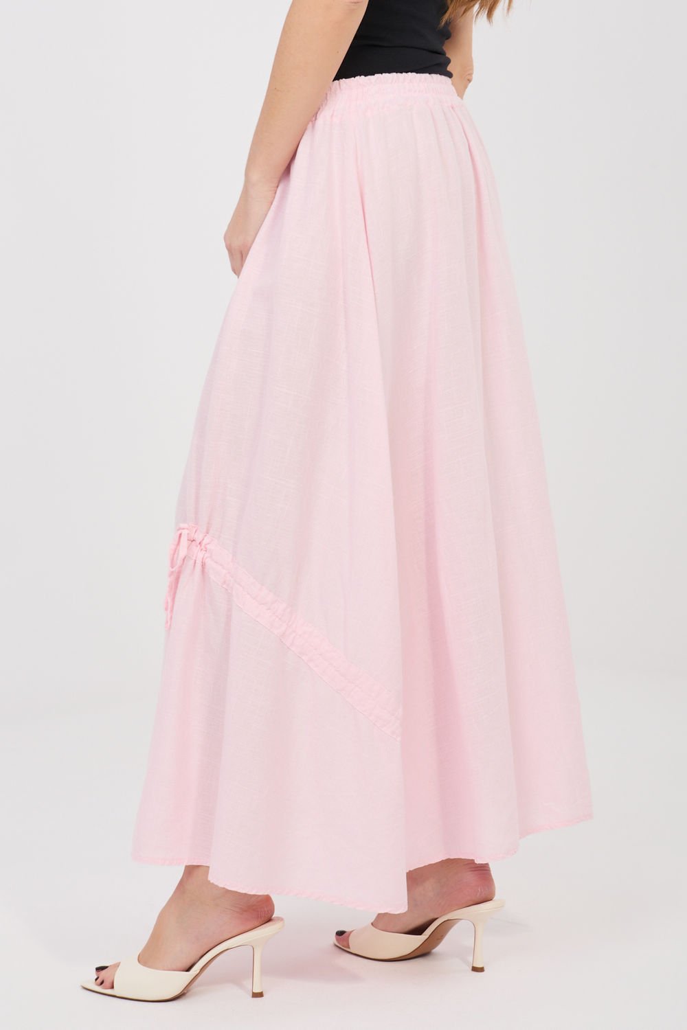 Long women’s skirt in casual style, perfect for everyday styling. Its smooth pattern makes it versatile and easy to match with various wardrobe items, from light blouses to classic shirts or tops. The model is made of high-quality lyocell, cotton, and linen blend, making the fabric lightweight, breathable, and comfortable to wear. Natural fibers make the skirt perfect for warmer days, providing comfort throughout the day. The skirt has an elastic band sewn into the waist, which guarantees a comfortable fit to the silhouette and freedom of movement. The lack of a classic fastening makes the model easy and quick to put on. Decorative ties on the front add a subtle, feminine character to the whole and serve as a stylish finishing touch.