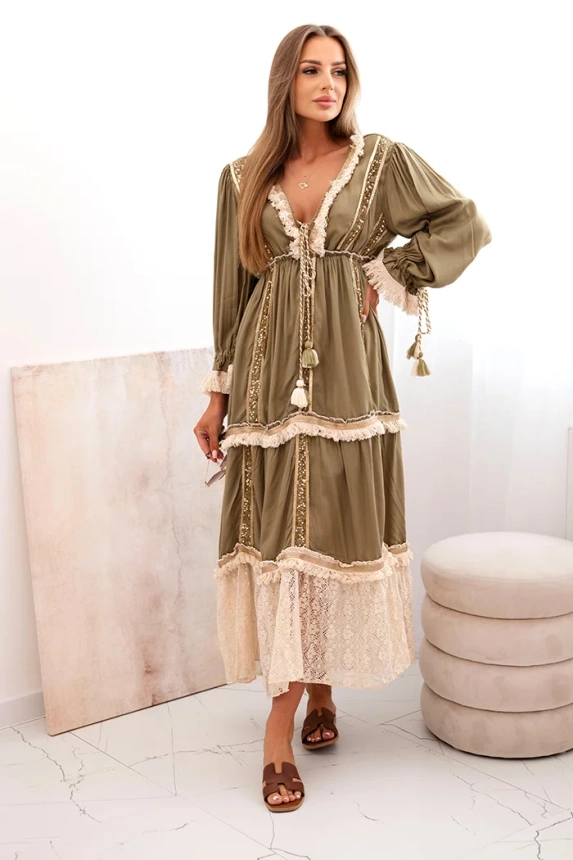 Leiskite sau šiek tiek laisvės ir elegancijos bohemišku stiliumi! Ši išskirtinė moteriška suknelė žavi originaliu kirpimu ir subtiliomis detalėmis, kurios traukia akį. Pagaminta iš 100 % lengvos ir kvėpuojančios viskozės, puikiai tinka šiltesnėms dienoms – pasivaikščiojimui, vasaros šventei ar atostogoms. Gilus V formos iškirpimas, dekoratyvūs kutai, nėriniais puoštos apdailos ir švelnios blizgios detalės suteikia jai išskirtinį charakterį. Elastingas juosmuo su raišteliu ir pomponais užtikrina komfortą ir prigludimą prie figūros. Ilgas, šiek tiek platėjantis siluetas gražiai krinta judant ir suteikia įvaizdžiui lengvumo. Dydis universalus – tinka moterims, dėvinčioms S, M arba L dydį.