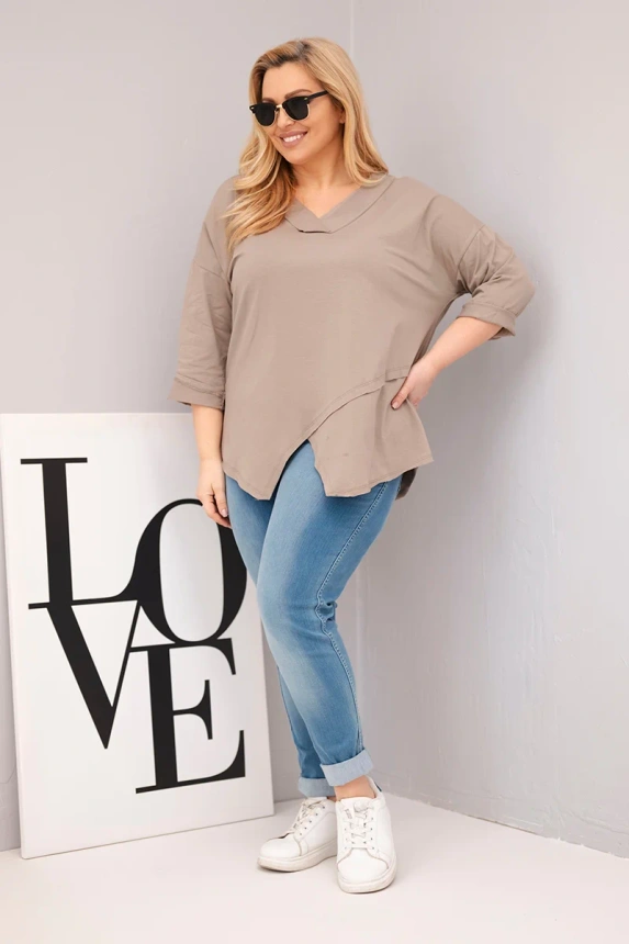 Moteriška medvilninė bluzonė Plus Size su giliais V formos iškirpimu ir asimetrišku apačia fango