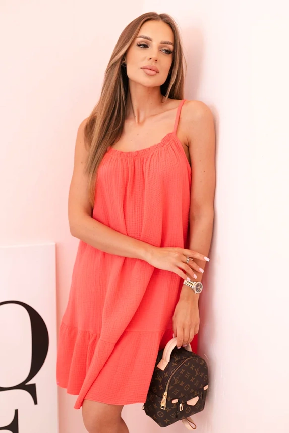 Lengva ir orui pralaidi moteriška muslino suknelė su petnešėlėmis ir raukiniais – puikus pasirinkimas šiltoms vasaros dienoms. Pagaminta iš 100 % natūralios medvilnės, džiugina švelnumu ir minkštumu, užtikrinančiu maksimalų nešiojimo komfortą. Laisvas siluetas su platėjančia apačia ir raukiniais gražiai krinta ant figūros, maskuoja smulkius trūkumus ir suteikia visišką judėjimo laisvę. Šis modelis puikiai tiks tiek pasivaikščiojimui paplūdimyje, tiek susitikimui su draugais vasaros vakarą. Elastinga guma iškirptėje subtiliai pabrėžia pečius, o plonos petnešėlės suteikia lengvumo ir moteriško žavesio. Dėl savo universalumo lengvai derinasi su sandalais, skrybėle ar boho rankine. Dydis universalus, tinka M, L, XL dydžiams.