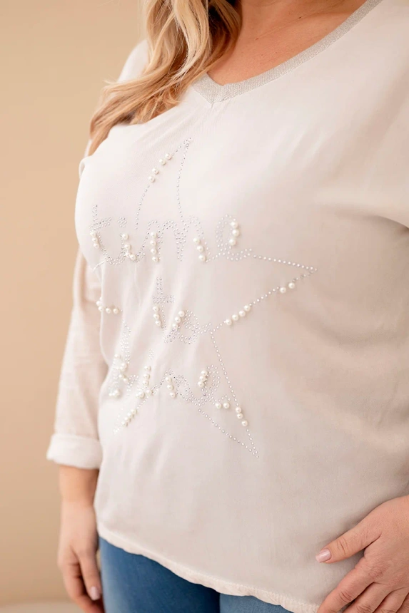 Stilinga ir moteriška palaidinė su užrašu „Time to Shine“, integruota į žvaigždės formą, papuošta smulkiais perliukais ir blizgučiais, yra puikus pasirinkimas moterims, kurios mėgsta subtilų blizgesį ir originalius akcentus kasdienėse stiliaus deriniuose. V formos iškirptė puikiai paryškina kaklą, o ilgesnis nugaros kraštas suteikia visumai lengvumo ir komforto.