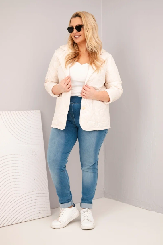 Stilinga ir itin lengva moteriška pūkinė striukė yra puikus pasirinkimas pereinamuoju laikotarpiu, kai reikia aprangos, kuri derina funkcionalumą su madingu įvaizdžiu. Modelis išsiskiria gėlių raštu, kuris suteikia jai moteriško žavesio ir originalumo. Uždarymas mygtukais ir klasikinis apykaklė suteikia visumai elegantiško charakterio, kuris tinka tiek kasdienai, tiek iškilmingesnėms stilizacijoms.