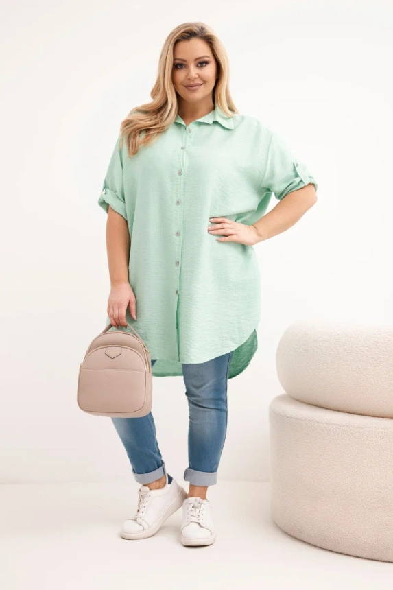 Ši išskirtinė moteriška oversize marškiniai yra laisvo stiliaus ir elegancijos derinys. Pagaminta iš lengvos, kvėpuojančios viskozės, puikiai tinka šiltesnėms dienoms, užtikrindama maksimalų komfortą. Laisvas plius dydžio kirpimas garantuoja patogumą, o ilgesnis galas ir 3/4 ilgio rankovės su galimybe prisisegti suteikia modernų charakterį.