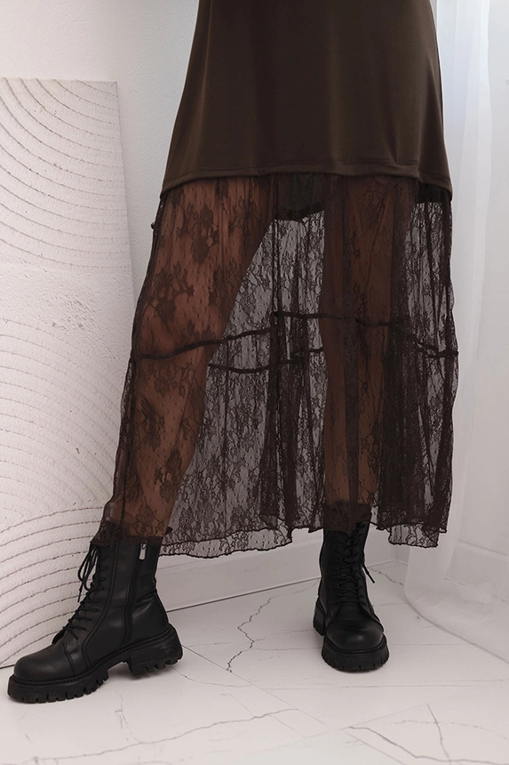 Ši moteriška suknelė su tiulio apačia ir rankovėmis yra puikus pasirinkimas moterims, kurios mėgsta išsiskirti stilingu, bet tuo pačiu patogiu apranga. Viršus pagamintas iš minkštos modalinės medžiagos užtikrina dėvėjimo komfortą, o šiek tiek oversize modelis garantuoja judėjimo laisvę. Tuo tarpu šiek tiek permatoma tiulio apačia ir rankovės suteikia visumai lengvumo ir madingo, moteriško charakterio.