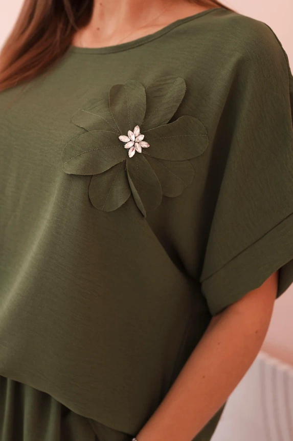 Patogus ir stilingas moteriškas komplektas, pasiūtas iš minkšto, elastingo viskozės trikotažo – puikus pasirinkimas kasdienai ir laisvalaikiui. Palaidinė laisvo kirpimo, trumpomis rankovėmis, papuošta didele gėlių aplikacija su blizgiu akcentu – suteikia išskirtinumo. Kelnės su plačiomis klešnėmis, elastingu juosmeniu ir raišteliu – visiška judėjimo laisvė ir komfortas. Komplektas puikiai atrodo tiek namuose, tiek mieste – tereikia tinkamų aksesuarų!