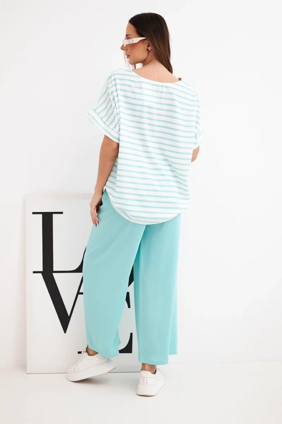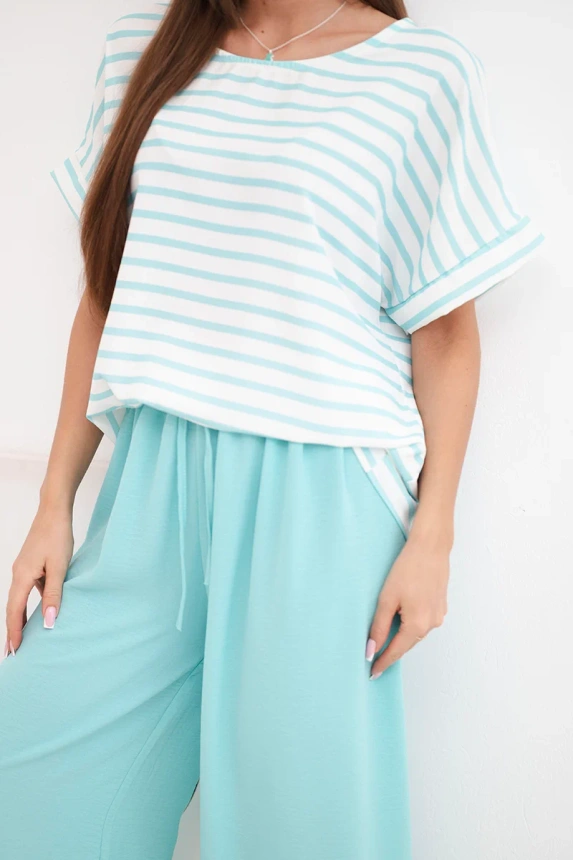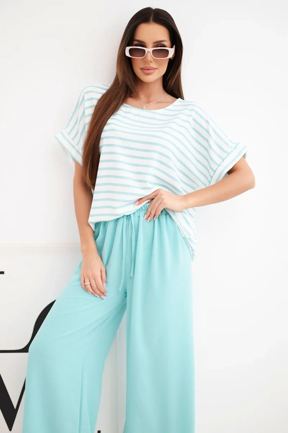 Moteriškas iš viskozės su juostuota palaidine ir plačiomis kelnėmis su guma