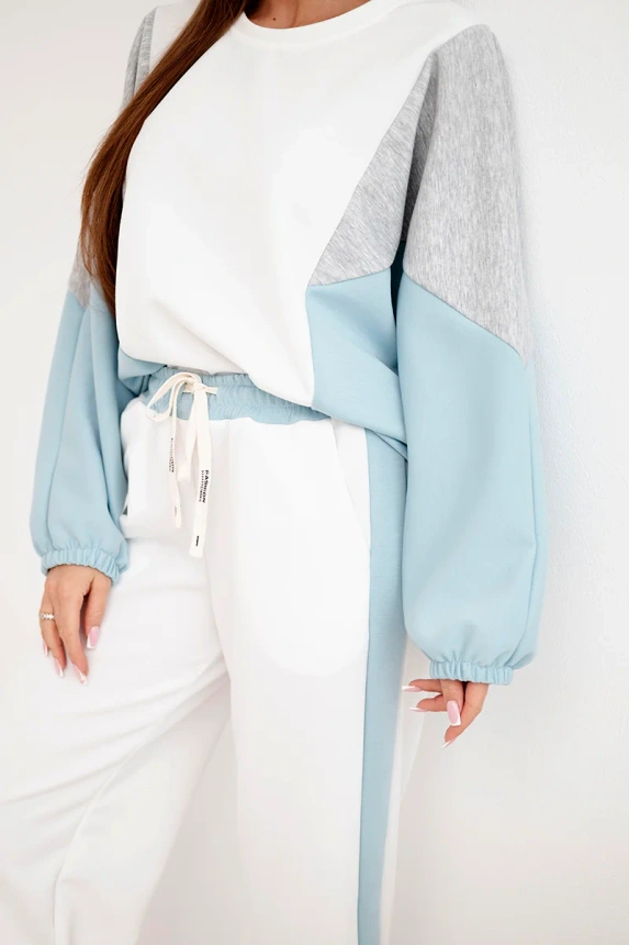 Laisvas megztinis su nuleistomis pečių linijomis ir rankogaliais suteikia judėjimo laisvę ir išskirtinį patogumą. Kontrastingos detalės prideda madingo, šiuolaikiško charakterio. Kelnės su elastingu juosmeniu ir plačia kojos apatine dalimi garantuoja komfortą visą dieną, o jų minimalistinis kirpimas gražiai pabrėžia siluetą.