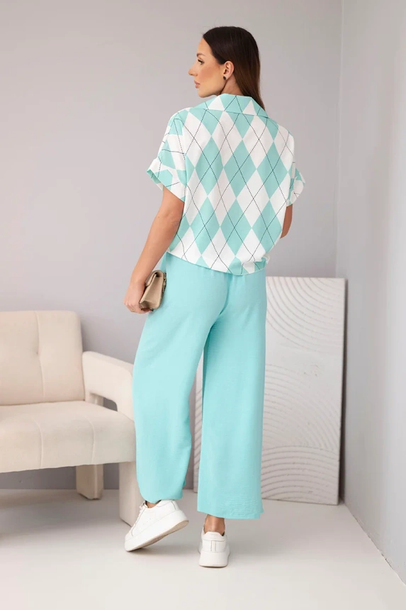 Pasirinkite žavingumą ir patogumą su šiuo madingu moterišku komplektu! Trumpa marškinė su apykakle ir įspūdingu raiščiu priekyje pritraukia dėmesį subtiliu rombų raštu, kuris suteikia visumai švelnios elegancijos. Platus kelnių modelis su guma juosmenyje pagamintas iš lengvos, plazdančios medžiagos užtikrina komfortą ir judėjimo laisvę visą dieną. Šis komplektas puikiai tinka kasdienai, susitikimams su draugais ar vasaros pasivaikščiojimams. Jį galima dėvėti kartu arba atskirai, sukuriant daugybę moteriškų stilių.