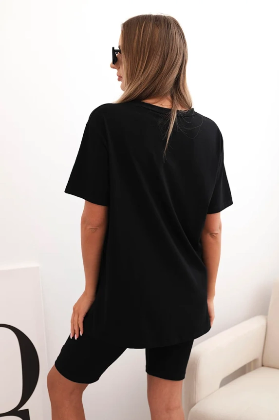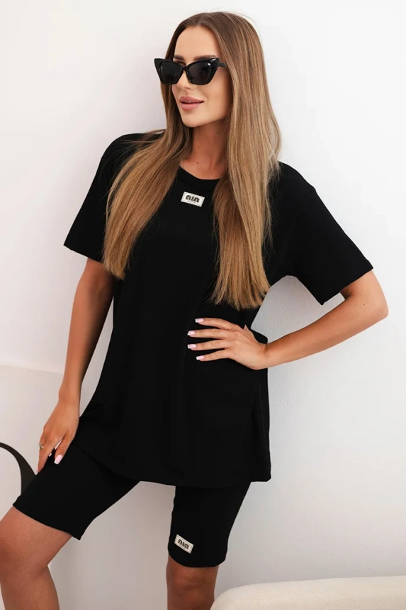 Komplektas pasiūtas iš malonios prisilietimui medvilnės su elastano priemaiša, todėl yra tamprus ir patogus dėvėti visą dieną. Laisvas kirpimas suteikia komforto, o elastingas šortų juosmuo prisitaiko prie figūros. Palaidinė turi apvalią iškirptę ir paprastą fasoną, kuris tinka bet kokiam laisvalaikio stiliui. Dydis universalus – tiks moterims, dėvinčioms S, M arba L dydžius.
