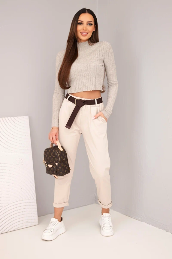 Madingi ir patogūs moteriški kelnės su diržu yra idealus pasirinkimas moterims, vertinančioms stilių ir komfortą. Pagaminti iš aukštos kokybės medžiagos, užtikrina judėjimo laisvę ir puikų pritaikymą prie silueto. Turi elastingą juosmenį ir praktišką diržą, kuris akcentuoja liemenį. Jų klasikinis siluetas su suknegtu klešnės kraštu leidžia jas derinti tiek prie kasdienių, tiek prie elegantiškesnių stilių. Puikiai tiks su marškiniais arba lengvu megztiniu. Dydis yra universali ir tiks ponios, turinčios S, M arba L dydį.