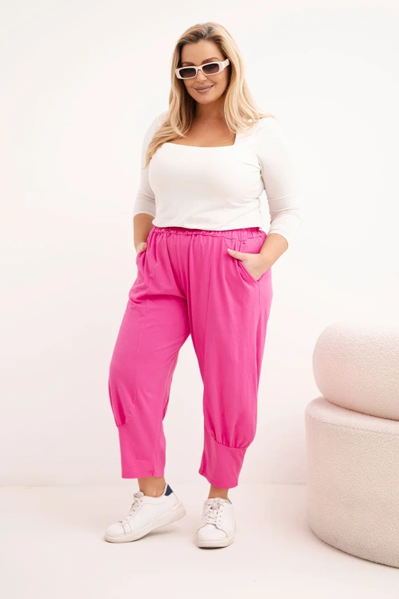 Patogumas ir stilius viename? Šie moteriški plus size kelnės atitiks net pačių reikliausių klientų lūkesčius! Modelis su laisvu siluetu, šiek tiek sumažintu juosmeniu ir plačiomis kojomis užtikrina visišką judėjimo laisvę ir maksimalų komfortą visą dieną. Elastinga juosmens juosta su guma prisitaiko prie figūros, todėl tai yra ideali pasirinkimas moterims, vertinančioms patogumą be mados išvaizdos atsisakymo.