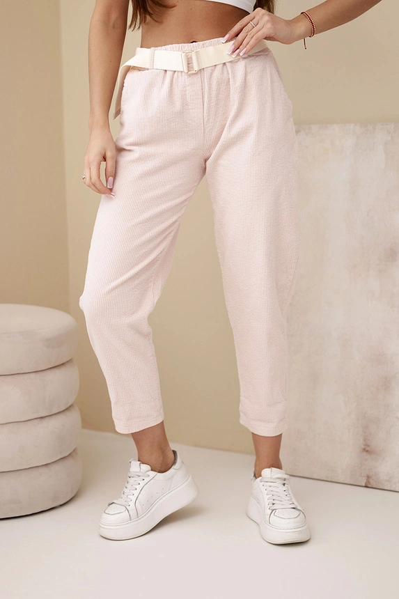 Patogūs ir madingi moteriški kelnių iš minkštos štruko yra puikus pasirinkimas vėsesniems orams. Jų modernus siluetas su siaurėjančiomis kojomis ir elastingu juosmeniu užtikrina idealų prigludimą prie figūros ir didelį komfortą dėvint. Komplekte yra medžiaginis diržas, kuris pabrėžia liemenį ir suteikia stilingą akcentą visai aprangai.