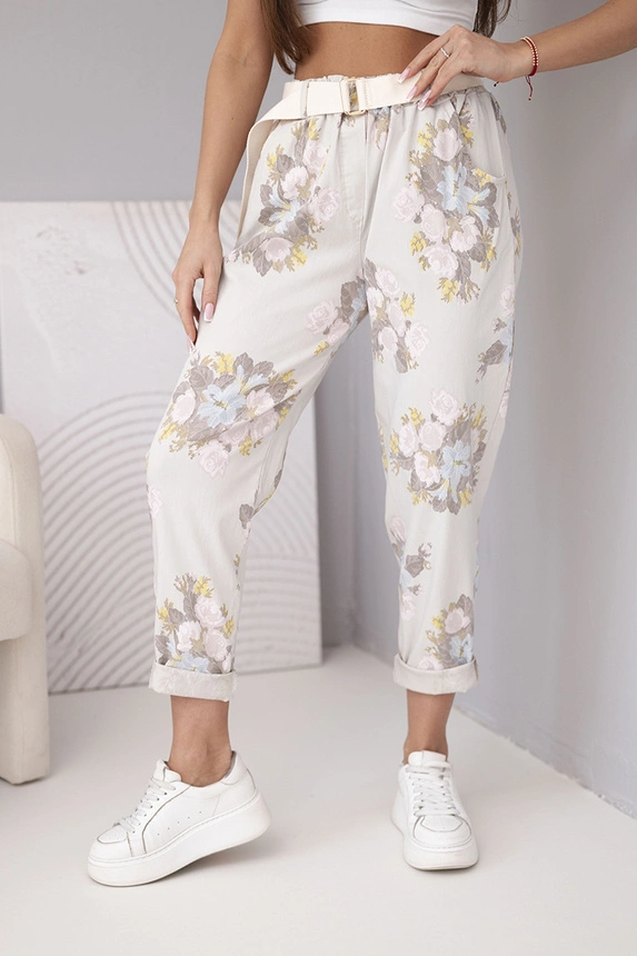 Kelnės turi elastingą juosmenį ir pridėtą audinį diržą, kuris gražiai pabrėžia liemenį. Aptemptos kojinės, baigiasi manžetėmis, suteikia visumai modernų charakterį. Gėlių spausdinimas daro jas puikiu pasirinkimu pavasariui ir vasarai – idealios kasdienėms stilizacijoms, pasivaikščiojimams ir kelionėms.