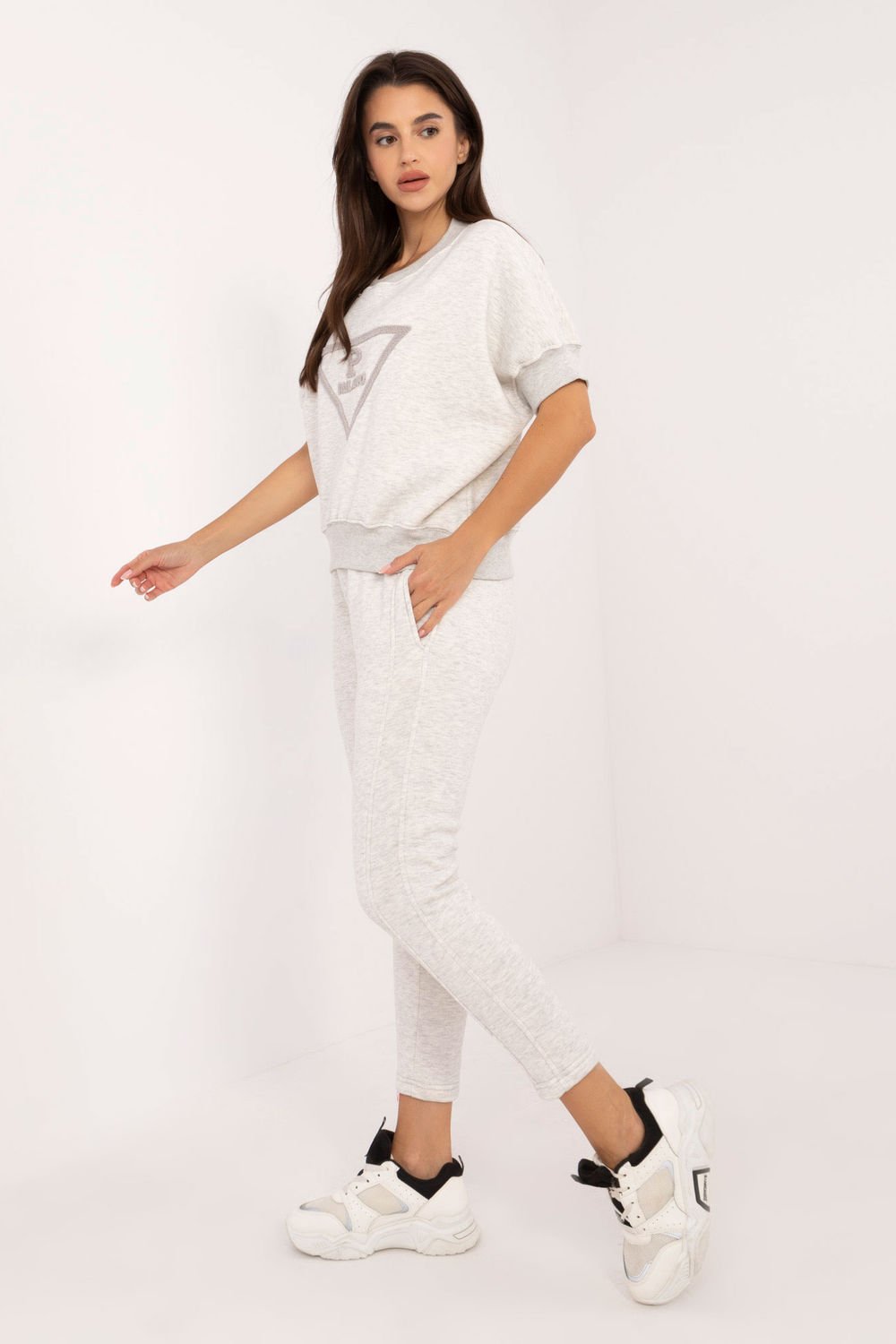 Insulated women’s casual sweatshirt set, ideal for colder days, consists of a sweatshirt and pants. Made from a combination of cotton and polyester, the set provides warmth, comfort and durability, ideal for everyday styling. The standard-length sweatshirt has short sleeves and a round neckline, giving it a lightweight and casual feel, despite the warmth. On the front of the sweatshirt there is a fashionable print, which adds originality and youthfulness to the set. The smooth design maintains a minimalist, universal look, easy to combine with other garments. The pants have tapered legs and a high waist, which accentuates the silhouette and ensures wearing comfort. There is an elastic waistband that guarantees a perfect fit. In addition, the pants are equipped with side slip pockets, making them a practical choice for everyday wear. This set is the perfect combination of comfort and style for cold, everyday days.