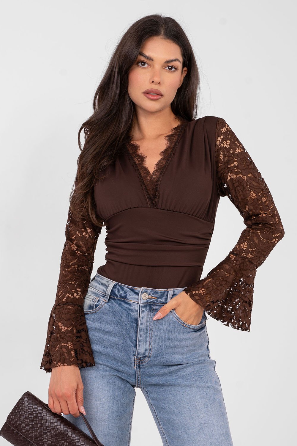 Elegant bodysuit made of a blend of polyester and elastane, combining comfort with refined style. The model of standard length with a sweetheart neckline emphasizes the silhouette and gives the whole a subtly feminine character. The long, flared sleeve made of lace adds lightness and elegance, and decorative pleats on the front of the fabric are a stylish detail that distinguishes the bodysuit. The built-in, stiffened cups and practical hook fastening ensure high functionality, making it easy to put on and take off. The dominant smooth pattern makes the bodysuit versatile and perfect for both special occasions and elegant everyday stylings.