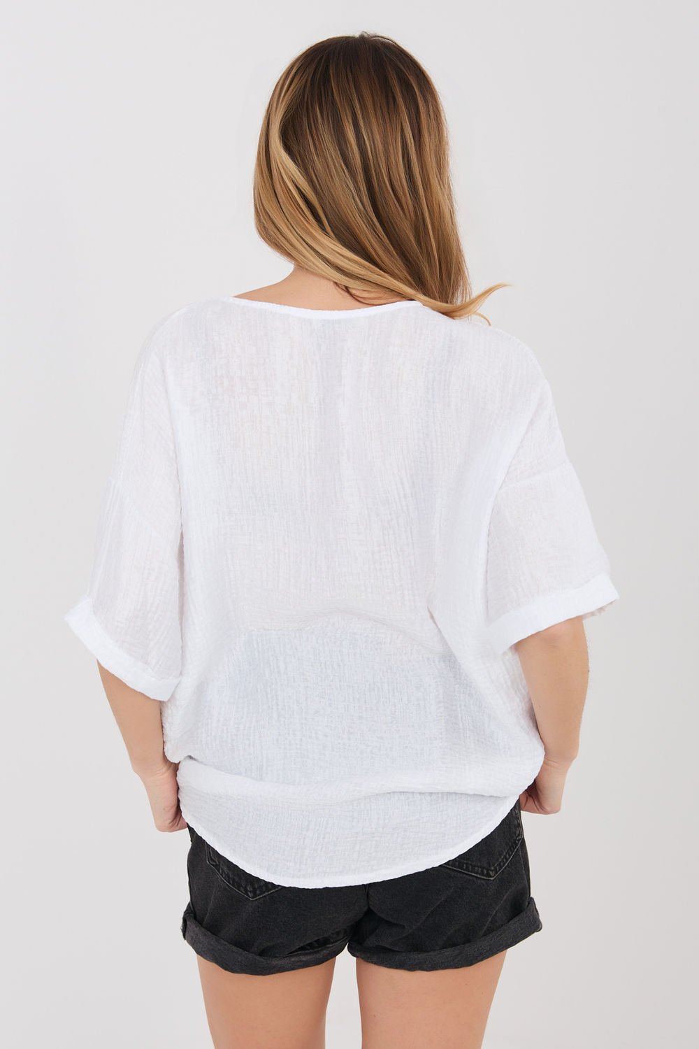 Women’s shirt with a light and comfortable cut, perfect for everyday styling. Made of a pleasant to the touch fabric that is a combination of viscose and nylon, making the material breathable, lightweight, and well-fitted to the silhouette. The model stands out with a varied texture of the material, which gives the shirt an interesting and stylish character. The shirt does not have a collar, and the V-neck subtly emphasizes the neckline and adds a feminine lightness to the whole. The short sleeve makes the model perfect for warmer days. The standard length allows you to wear the shirt both tucked into pants or a skirt and loosely. The button closure is practical and makes it easier to put on, while also being a classic finishing element.