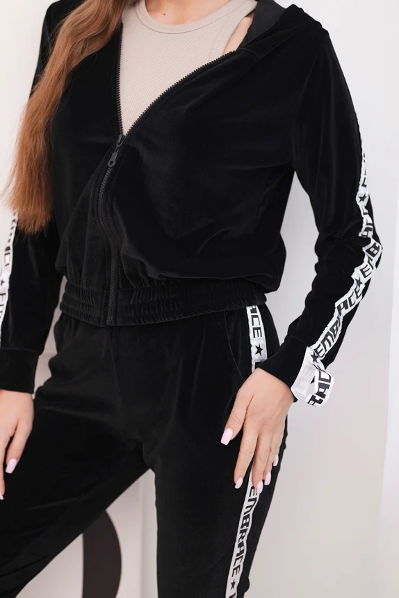 Pristatome jums džemperio ir kelnių rinkinį. Rinkinys iš veliūro. Džemperis turi gobtuvą ir užtrauktuką. Dekoratyvinė juostelė ant pečių su užrašu. Marškinėlių apačioje yra įsiūta guma. Kelnės su kišenėmis ir juosta ant kojų. Labai madingas ir stilingas rinkinys. Rinkinys pagamintas iš aukštos kokybės medžiagos. Dydis yra universalus ir tinka S, M arba L dydžio moterims.