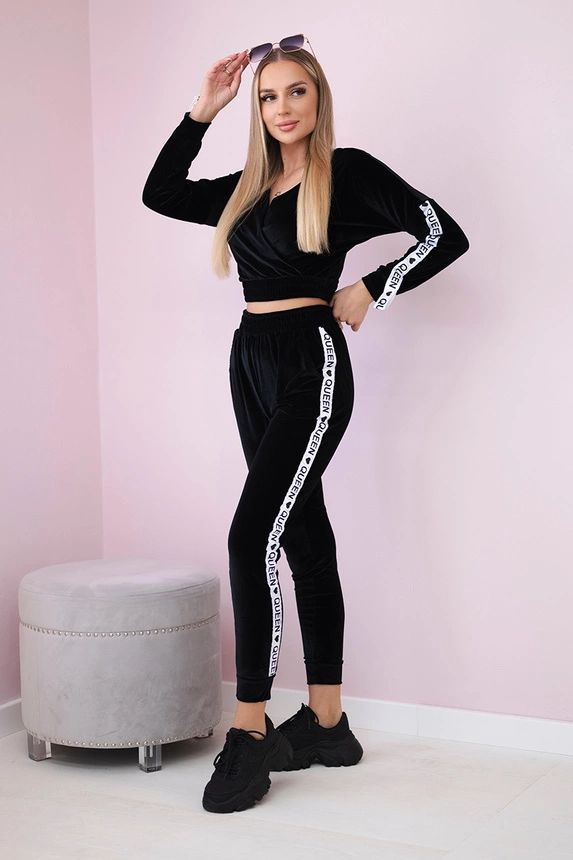 Pristatome jums džemperio ir kelnių rinkinį. Rinkinys iš veliūro. Džemperis su iškirpte. Dekoratyvinė juostelė ant pečių su užrašu. Marškinėlių apačioje yra įsiūta guma. Kelnės su kišenėmis ir juosta ant kojų. Labai madingas ir stilingas rinkinys. Rinkinys pagamintas iš aukštos kokybės medžiagos. Dydis yra universalus ir tinka S, M arba L dydžio moterims.